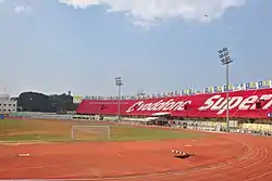 The stadium was renovated; its existing football ground including clearing and rearranging drains, rearranging the playing arena to accommodate new 6 lane synthetic track, dismantling and renovating the spectator steps as per necessity, turfing, new chain link fencing to the track, provision of structure for score board etc. for 35th National Games.[2][3][4][5]