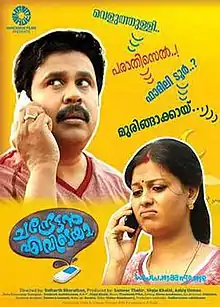 Chandrettan Evideya (transl. Where is Chandrettan)[6] is a 2015 Malayalam-language romantic fantasy comedy film directed by Sidharth Bharathan. The film was produced by Sameer Thahir, Shyju Khalid and Ashiq Usman.[7] It stars Dileep alongside Anusree and Namitha Pramod in the main roles. It is the second directorial of Sidharth. The story and screenplay is penned by noted author Santhosh Echikkanam who had teamed up with Sidharth in his directorial debut Nidra (2012). The songs are composed by Prashant Pillai. Cinematography is handled by Shyju Khalid and editing by Bavan Sreekumar. The costumes are designed by Mashar T Hamsa.