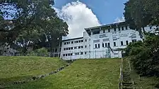 The vacated hospital compound was popular with film-makers after the Singapore Land Authority commenced a short-term rental programme of the abandoned and derelict buildings that was once Changi Hospital. Many popular MediaCorp television series such as Growing Up, The Crime Hunters, C.I.D. and Incredible Tales were partly filmed at the now-abandoned hospital, which by the 2000s was already badly damaged and entirely desecrated by hundreds of vandals, criminals, drug-users and possible Satanists. Around this time, Old Changi Hospital, as it is popularly known, was famously declared by many Singaporeans, young and old alike, to be one of the most haunted locations in the whole country.[4] The buildings are said to be haunted by the souls of the victims of the Japanese Occupation, homeless ghosts and the spirits of those who died in the hospital. In 2017, a video of sightings of a nurse carrying a baby in the haunted hospital circulated around the Internet, sparking debate on its authenticity and the spookiness of the former hospital and the supposed paranormal activities inside.[5] Until now, the authenticity of this video has not yet been proven. The once-abandoned and derelict buildings and its ghostly reputation were the basis for the 2010 mockumentary Haunted Changi, which, using found-footage, told of a small group of paranormal investigators going inside the hospital to learn of its horrifying past and ended with terrifying outcomes to each member. Some of the more prominent areas of the old hospital that was famous for hauntings include the old mortuary which has since been demolished, the tile-walled operating theatre and the old hospital's Accident-and-Emergency (A&E) building (located below the hill from where the main hospital is located at has long been demolished already). There is also a widespread belief of the presence of supposed underground bunkers beneath Changi Hospital (from the days when it was a military base), although there is currently no available access to them and their alleged entry-points (rumoured to be 3) are also closed off. A picture had been taken at Changi Aloha Chalet near the hospital and allegedly showed what was seen as a ghost. According to the owners of the photo, their room was located right opposite Changi Hospital and the abandoned (and infamously-haunted) Aloha Changi Resort.[6]