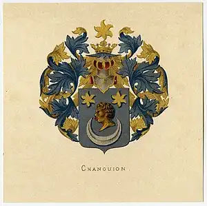One of the Dutch branches of the Changuion family, from which sprouted the South African branch, started with Jean Changuion, who was born in Vitry-le-Francois in 1660 and settled in Halle (Saale) in Germany where he died in 1700. His son François (1694-1777) was baptised in Frankfurt (Oder) in 1694 and moved to Amsterdam in about 1717 where he was burgher and bookdealer. In 1724 Francois established a printing house, which would become very successful.[3] His grandson François Daniël (1766-1850) was elevated to the Dutch nobility on 16 September 1815 due to his role as secretary of the provisional government of the Netherlands (the Triumvirate under Van Hogendorp) in 1813. Thanks to his role as secretary, he is considered one of the founders of the Kingdom of the Netherlands.[4] Through his elevation to the nobility, he and his descendants were allowed to use the predicate jonkheer and jonkvrouw. (In addition, as a member of the nobility, he was given the right to bear a crown in the crest of his coat of arms.[5])