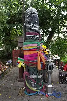 The shrine is named after Chao Mae Tuptim, a pre-Buddhist Southeast Asian tree spirit,[5] who is said to bestow blessings on those who worship her at the shrine.[6][5] The site attracts women from all across Thailand and even other east Asian countries.[7] A plaque reads: "Chao Mae Tuptim has received yet another rather less conventional kind of gift, phallic in shape, both small and large, stylized and highly realistic. Over the years, they have been brought by the thousands."[8]