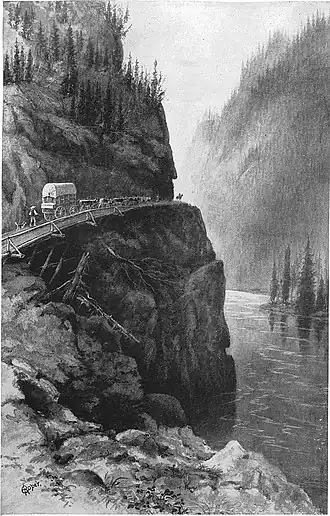 In 1862, Joseph Trutch completed the Chapmans Bar–Boston Bar leg of the Cariboo Road along the east shore. The tender contract mentioned a road toll to recover the construction costs.[11]