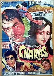 Charas (transl. Marijuana) is a 1976 Indian Hindi-language action thriller film produced and directed by Ramanand Sagar. It is set against the backdrop of the expulsion of Indian community from Uganda by its dictator Idi Amin in 1972. The film stars Dharmendra, Hema Malini, Ajit, Amjad Khan, Sujit Kumar, Aruna Irani, Asrani, Keshto Mukherjee and Tom Alter. The film's music is by Laxmikant–Pyarelal.