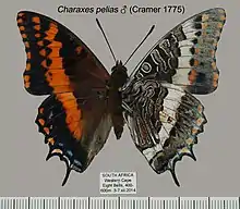 Charaxes pelias, the protea emperor or protea charaxes, is a butterfly of the family Nymphalidae, and is endemic to the Cape Provinces in South Africa.[4][5][6]