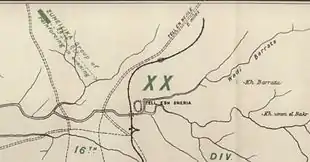The 11th Light Horse Regiment had moved out to take up a line from Kh. Barata to the Wadi el Kerkerty by 10:00, with the 12th Light Horse Regiment on their right extending the line to the wadi Barata.[28] At 10:15 Chauvel ordered Hodgson to "move with centre on Kh Buteiha [3,000 yards (2,700 m) west, north-west of Tel esh Sheria] via G. 23 central [on the railway 1,000 yards (910 m) north of the wadi]."[41] Chauvel gave Hodgson "his exact line of advance,"[42] "a definite axis of advance and objective,",[33] "against a very hard section,"[42] "through defined squares on the map of operations, with his centre on a mud hut at Khurbet Buteihah, on the ridge behind the Turkish line of defences,"[34] but a delay allowed the Ottoman rearguard to strengthen the position before the charge began.[33] The direction of this advance had been laid down by the Egyptian Expeditionary Force General Staff in a letter written at 11:07 on 4 November. The orders for the "XXth Corps and Desert Mounted Corps" attacks on 6 November, included an advance "by the XXth Corps on the line Kh Buteihah - Sheria - Kh Kauwukah."[43] The two objectives of this advance were to push the enemy rearguard back from the 60th (London) Division, to give the infantry room to concentrate, and to enable the Australian Mounted Division to gain touch with the Anzac Mounted Division.[41]