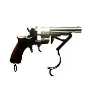 The original Galand revolver was a double-action, open frame (no strap across the top of the cylinder) revolver patented in 1868. Military versions were produced in 9 mm while civilian versions were made in 12 mm. The gun is easily recognizable due to its long extraction lever, which stretches under the gun to form the trigger guard. Pulling the lever forward separates the barrel and cylinder from the rest of the gun. At the same time the extractor plate is blocked which catches any cartridges in the cylinder, thereby extracting them.