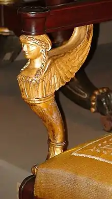 Lannuier's furniture is characterized by its use of architectural motifs–-columns, brackets, pediments, and pilasters; Greek and Roman motifs including anthemions, lyres, caryatids, dolphins, laurel wreaths, and winged figures. Federal motifs associated with the early Republic include eagles and five- or six-pointed stars. Large figures were carved and gilded, while smaller decorative mounts were cast in bronze and gilded.