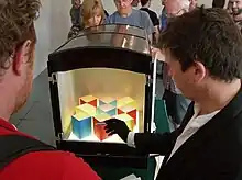 The participant is informed that at least two of the coloured cards are a matching pair, and is asked to select the matching pair. The player's perception may be influenced by factors such as the lighting inside the cabinet and by reflected hues from the closely situated primary coloured cards. Once the player has decided, the chosen cards are sealed within an envelope.[6]