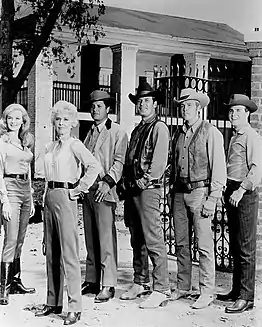 ![]() Briles (right) with The Big Valley cast, 1965 | |