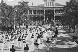 "Kamehameha Waltz" was penned by King as a paean to his alma mater and to Bernice Pauahi Bishop who created the trust fund that established the school, "Majestic stands Kamehameha/My home of education"..."For you, O great Pauahi, high chiefess/Our exclamations of joy".[11] The song was performed in 1914 by the King Glee Club as part of The Woods of Hawaii musical presentation at the Honolulu Opera House, sponsored by the Christian youth organization Young People's League.[12] It was first recorded on May 18, 1928 by the Charles E. King Male Chorus on the Columbia Records label.[13] Since then, it has become a standard at the school's annual song contest.