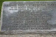 Charles Ferguson Hoey, VC as inscribed on the cenotaph in the Charles F. Hoey VC Memorial Park in downtown Duncan, BC