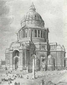 In 1902, Reilly applied unsuccessfully for the chair of architecture at University College, London.[1] In the same year he entered the open competition for the design of the proposed new Liverpool Cathedral. He detested the Victorian Neo-Gothic style, describing the work of a leading proponent, Alfred Waterhouse, as having the "colours of mud and blood".[9] His proposed design was in the English Neo-Classical style, with a large central dome in the tradition of Wren's St Paul's.[10] The assessors of the competition were G F Bodley, a leading exponent of the Gothic style, and Norman Shaw. Reilly's design was one of eight highly commended entries that failed to gain inclusion in the final shortlist of five; it was the only classical design among them. Giles Gilbert Scott's Gothic design was the eventual winner,[11] but Reilly had made influential contacts in Liverpool, where much of his career came to be centred.[n 2][3]