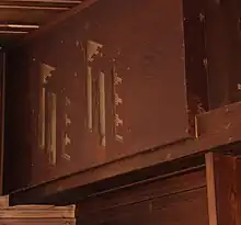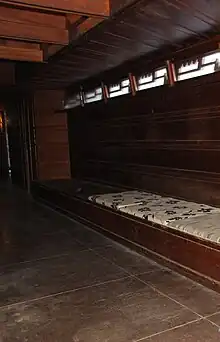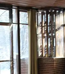 Common to many Wright homes, there are carved wood panels that filter natural light, as well as built-in bookshelves, window seating, and tables.[9]