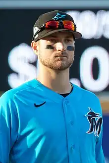 On December 8, 2021, Leblanc was selected by the Miami Marlins in the minor league phase of the Rule 5 draft.[9] He opened the 2022 season with the Triple–A Jacksonville Jumbo Shrimp.[10] On July 29, 2022, Miami selected Leblanc's contract and called him up to the major leagues for the first time.[11] On July 30, LeBlanc collected his first career hit, a standup double off of New York Mets starter Carlos Carrasco.[12] The next day, LeBlanc hit his first career home run off of Philadelphia Phillies starter Taijuan Walker.[13]