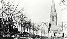 St Bartholomew's, in Hall Lane, Ripleyville, Bradford, West Yorkshire, was designed by TH and F Healey of Bradford.[37] The foundation stone was laid on 10 April 1871,[38] and the church was consecrated on 10 December 1872,[37] when the spire was still unfinished.[39] It was not completed until 1874. Henry William Ripley, who created Ripleyville, contributed the site.[37] The church was demolished around 1965, and the present location of the pulpit and font is unknown. The building was designed in the "Gothic style of architecture." In 1872 the Yorkshire Post and Leeds Intelligencer reported: "The upper part of the pulpit and the font are of Caen stone, designed by Mr. Mawer of Leeds."[37] The Leeds Times reported that the pulpit was of "neat design."[39]
