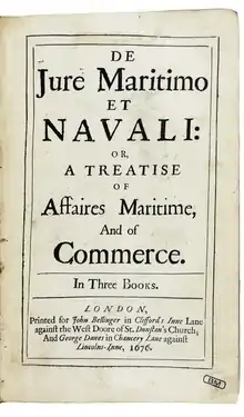 Molloy was the compiler of an extensive treatise on maritime law and commerce, entitled De Jure Maritimo et Navali. It was successful despite its derivative nature:[2] its content was not much advance on the Consuetudo vel Lex Mercatoria by Gerard Malynes, and the coverage of law concerning bills of exchange was said by a later author[3] to be inferior to the treatise of John Marius. It was a standard work on the subject, till superseded by the publications of James Alan Park, Samuel Marshall, and Lord Tenterden.[1] Its importance was its orientation towards the perspective of merchants.[4]