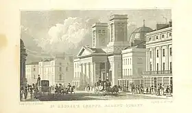 Cockerell's first building (1818–20) was in the style of Tudor architecture, the brick building at Harrow School, now known as the 'old schools' has twin crow-stepped gables.[33] His next commission was the classical Hanover Chapel (1821–25) Regent Street, with its twin towers and projecting tetrastyle Ionic portico, later demolished (1896).
