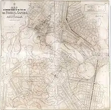 Griffin's plan for Canberra drawn on top of Scrivener's contour map of the area