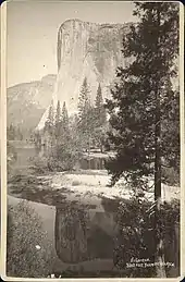 By 1866 Savage's Views of the Great West, a stereoscopic series, was sold by the Union Pacific and Denver & Rio Grande Western railroads. These railroads gave him a free pass to ride wherever he wanted.[10] The same year he took a tour of major photography studios in the United States, both to improve his photography skills and to publish reproductions of his photos. In San Francisco, he met Carleton Watkins, who described his method for producing large works by placing developed negatives in a water bath until he was ready to finish them. Savage noted that Watkins's method was cumbersome, but envied his results.[19] He traveled by boat to New York City, where progress in photography instruction and technology inspired him. While in New York City, he made an agreement with Samuel R. Wells, who sold photos that Savage took, while Savage sold Wells' publications in his photography studio back in Utah. Savage made similar agreements with other distributors.[20] After having a darkroom wagon custom made, spending $3,400 on photographic supplies from E. and H.T. Anthony Co., he traveled with a group of Mormon settlers back to Salt Lake City.[21] Most of his new supplies were lost when his wagon tipped over while crossing the Platte River on his return trip. Savage paid back some of the debt over nine years, but stopped paying when he was on the verge of bankruptcy. The company sued him, and after a long legal battle, the debt was settled in 1883.[22]