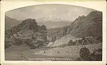 A scenic view of a pass through bluffs with snowcapped mountains in the background, c. 1874