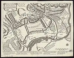 Charles entered service in the French army in 1676[3] as a musketeer, in the second company of the Mousquetaires du Roi (mousquetaires noirs[9]), where he eventually ended up as sous-brigadier.[10] He was wounded at the Battle of Blenheim.[lower-alpha 4][3] He commanded the artillery of the French army as lieutenant-général de l'artillerie in 1707 under Villars. The next year he took part in the Rhine campaign of the Elector of Bavaria.[2] In 1709 he fought at the Battle of Malplaquet. There he faced the Dutch attack of the Prince of Orange on the French right. When the Dutch entered the French entrenchments despite suffering heavy casualties de Quincy was proud not to see any soldiers of his regiment flee; Except one called Le Rouge. He was very lucky, because ... I ran after him to pierce him with my sword, [but] I fell, fortunately for him. This gave him time to rejoin his company. Afterwards, he swore to me that his company had run out of powder and that he had gone to get it. But his subterfuge was implausible, because we had only ordered the tambourineers to go and get it if the soldiers ran out.[11] After the Peace of Utrecht he was appointed governor of Auvergne. He was a chevalier de l'ordre militaire de Saint-Louis.[6][12]