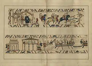Engravings from Stothard's drawings of the Bayeux Tapestry were made by James Basire, and published in 1823.[7] They show the complete tapestry, and were described by the art historian Eric Maclagan as "exquisite plates [which] still provide what is in many ways the most adequate representation of the original".[8]