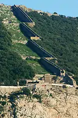 The upper section of Charles V Wall, somewhat further south, runs from the top of a cliff up to the crest of The Rock. It zigzags up the slope of The Rock in four stages in a configuration that lets the defenders give flanking fire to each face.[2] The Hacho (later the Signal Station) at the top of the wall was once equipped with a small tower.[3]