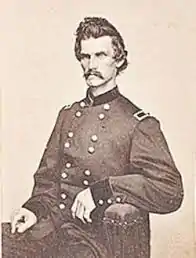 Blunt arranged three of his brigades in a line of battle south of Westport with Blair in support. As the battle raged back and forth Curtis arrived at the front with Blair's brigade and directed it into position perpendicular to the Kansas/Missouri state line. Fearful of a being outflanked, Blair initiated a counter-attack.[3] Curtis ordered the rest of the army forward in support of Blair's bold move. The attack bogged down, but at this critical moment Curtis personally led Blair's 9th Wisconsin Battery through a gulch which opened fire on the Confederate flank. This turned the tide of the battle and the Confederates began a retreat. Blair's brigade formed in the center of the Union army as it made a general advance against the faltering Confederate line.