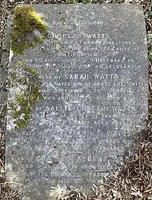 John Watts died from tuberculosis at the age of 32.[1] Charles Watts took charge of the publishing business and toured the country, delivering hundreds of lectures on theological, social, and political issues. He declared himself an atheist and, with Bradlaugh and others, helped found the National Secular Society (NSS) in 1866. In 1876, he was appointed full-time editor and publisher of the National Reformer. He also wrote and published a wide range of pamphlets on secularism and republicanism, and wrote the first systematic history of freethought, eventually published in book form as Freethought: its Rise, Progress and Triumph. His wife, Kate Watts, often travelled with him and also wrote pamphlets, including The Education and Position of Woman and Christianity: Defective and Unnecessary.[1][2]