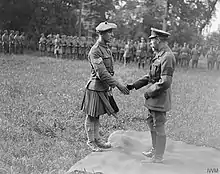 King George V investing Sergeant Charles William Train of the 2/14th Battalion, London Regiment (2nd Battalion, London Scottish) with the Victoria Cross at the Second Army Headquarters. Blendecques, 6 August 1918.