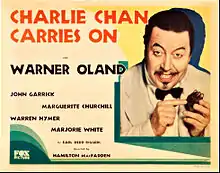 Charlie Chan Carries On is a 1931 American pre-Code mystery film directed by Hamilton MacFadden and starring Warner Oland, John Garrick and Marguerite Churchill. It is the first appearance of Warner Oland as Charlie Chan. Part of the long-running Charlie Chan series, it was based on the 1930 novel of the same title by Earl Derr Biggers. It is now considered a lost film;[1] however, Fox simultaneously filmed a Spanish-language version which was released under the title Eran TreceThere Were Thirteen—and this version survives.