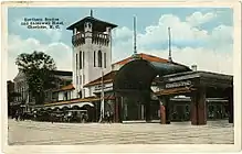 Opened in 1906, the Southern Depot (also referred as Southern Station) was designed by Frank Milburn and was located at 531 West Trade Street. Replacing the Richmond and Danville Depot, which was located in same area, the three-story Mediterranean style station had one side platform and one island platform operating on three tracks. The facility included waiting areas, ticket office and baggage facilities on the first floor; the second floor was dedicated to railroad use and a five-story tower. A separate two-story Southern Express Company (packaging services) building was located south adjacent to station, while the three-story Stonewall Hotel was located east adjacent to the station. Eaves on nearly all sides of the station, it also had a high arch going over two tracks, connecting with the island platform canopy.[8][14]