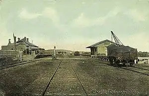 The station circa 1910, with three tracks running between passenger and goods shed platforms.