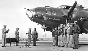 ![]() Gen. Jimmy Doolittle awards the Purple Heart to the aircrew of Boeing B-17E Fortress 41-9021 ‘Sweet Chariot’ at Chateau-dun-du-Rhumel Airfield, Algeria, July 1943. | |
