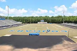 The Alumni Pavilion is located at the south end of the Arena. It contains 2,046 square feet (190.1 m2) of covered space and a 744 square feet (69.1 m2) viewing deck, and consists of steel beam construction, wood finished columns, and a concrete deck. The pavilion is positioned as an overlook to the Arena and has hosted numerous pre-game activities such as cookouts and booster meetings.[25]