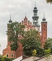 The town witnessed many wars and uprisings. The nearby Old Prussians besieged the town in 1268 and 1273.[8] Additionally in the 15th century the town experienced the wars between Teutonic Knights and Poland.[5] In 1410 the Polish army took the town and the bishop of Chełmno Arnold Stapil made a tribute to Polish King Władysław II Jagiełło. In 1422 Chełmża was taken again by the forces of the king and destroyed in large part. In 1454, the town joined the anti-Teutonic Prussian Confederation,[8] upon the request of which Polish King Casimir IV Jagiellon re-incorporated the region and town into Poland that same year, what was eventually confirmed following the Thirteen Years' War in 1466.[5][9] Synods of the Roman Catholic Diocese of Chełmno were held in Chełmża several times between the 14th and 17th centuries.[8] In 1552, Chełmża was visited by Polish King Sigismund II Augustus.[8] After Riga's dissolution in 1566 the bishops of Chełmno attended the councils of the Ecclesiastical province of the metropolitan of Gniezno. This practice was recognised by the Holy See by the Bull De salute animarum in 1821, when the Diocese of Chełmno became de jure a suffragan of the Archdiocese of Gniezno. Chełmno diocese was enlarged on that occasion (Górzno, Krajna and Działdowo). In 1621 and 1627 the town hosted the court of Polish King Sigismund III Vasa along with Prince Władysław.