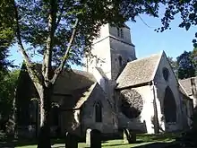 A view including the tower. The surrounding buildings make it awkward to get a fuller picture of the church.