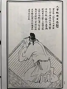 The History of Song, the official, government sanctioned history of the Song dynasty, published 1346, carries a biography of Chen Dong in chapter 455, as part of its biographical series on "Those Loyal to Righteousness".[5] Chen Dong is depicted in the Wu Shuang Pu (無雙譜, Table of Peerless Heroes) by Jin Guliang.[6] The images and poems for this book were widely spread and reused, including on porcelain works.[7]