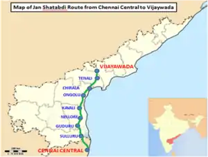 - ↑ "12077/Chennai Central - Vijayawada Jan Shatabdi Express - Chennai/MAS to Vijayawada/BZA". India Rail Info. Retrieved 15 January 2016.
