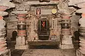The temple has all the basic elements of a standard Hoysala temple and comprises a sanctum which is connected to a closed hall by a square vestibule (sukhanasi). The entrance into the hall from the outside is through a porch (mukhamantapa). Typically, a closed hall in a Hoysala temple has no windows. The porch consists of an awning supported by two decorative half pillars with two parapets on both sides. The shrine has a tower (called shikhara). The vestibule has its own tower (also called sukhanasi) which appears like a low extension of the main tower over the shrine. Art critic Gerard Foekema calls it the "nose" of the main tower. From the outside, the walls of the vestibule are inconspicuous and appear like a short extension of the shrine wall.[4][5][6] The ceiling of the closed hall is supported by four lathe turned pillars. These pillars divide the ceiling into nine highly decorated bays.[5] Between full pilasters, the outer walls of the hall and shrine are decorated with turrets and miniature towers on half-pilasters (aedicula). Below these, forming the base of the temple, are the five horizontal moldings.[7]