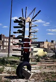 Alamo-Costello has worked on a range of public, temporary and experimental projects that present artwork in non-traditional settings to "non-art" audiences and explore themes of ephemerality, randomness, communication, and trust.[1][27][21] His first forays into this work came about as a founding member of "Armpit" (1992–8), a performance and public art group that included himself and artists Jesse Bercowetz, Nick Nuccio and Michael Plaza.[26][27] Between 1993 and 1995, they embarked on three "art walks"—the longest, a 298-mile Chicago-to-St. Louis trip—wheeling carts of their own sculpture as a "roving street gallery" bringing contemporary art to communities and viewers that normally have little contact with it in their own environments.[24][28][9] In 1994, they created a temporary display of large "urban drop-offs" or "urban totems" in empty Chicago city lots that they made from refuse (cinder blocks, hunks of concrete, scrap wood, tubes and old tires) found on-site.[26][21] The Chicago Reader's Fred Camper described it as a "guerrilla installation" of "near-chaotic accretions" that "gains much from its relationship to the site, and from the social goals that made the group choose it."[26][21]