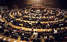 Chiara was invited to speak to a meeting of Italian politicians of various parties. It was May 2, 1996, in Naples. Her proposal to them was that, first of all, they should live fraternity among themselves and then bring this spirit to all their relationships with other politicians of different parties, with the goal that together they might achieve the common good. This gave shape to the Movement of Politics and Policy for Unity (MppU).[41] Chiara outlined its fundamental features on several occasions when she met members of the government in Slovenia, Spain, France, the Czech Republic, Brazil (1998) and Italy (2000).[42]