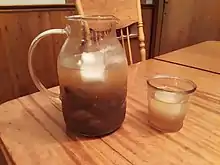 Chicha de piña is a Latin American spicy chicha made from pineapple crusts and cores, panela[1] or brown sugar, and spices such as cinnamon, clove, anise, and nutmeg. It is prepared simply by putting all the ingredients in a pot of water, boiling it, and then simmering it for an hour, before either chilling it to let the flavors further concentrate, or drinking it hot.[2] Some recipes also call for the addition of rice, milk, and vanilla.[3][4][5]