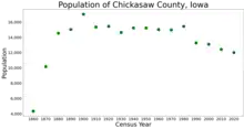 Chickasaw County is a county located in the U.S. state of Iowa. As of the 2020 census, the population was 12,012.[1] Its county seat is New Hampton.[2] The county was named for the southern Indian Nation whose chief was Bradford.