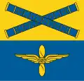 The command flag of the Chief of Air Force is drawn by Brita Grep and embroidered by hand by the company Libraria. Blazon: "Fessed in yellow and blue; on yellow two blue batons of command with sets of open yellow crowns placed two and one in saltire, on blue a winged two-bladed yellow propeller."[9]