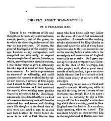 "Chiefly About War Matters", originally credited "by a Peaceable Man", is an 1862 essay by American author Nathaniel Hawthorne. The essay was inspired by the author's traveling during the American Civil War to experience more of the conflict firsthand. Upon its publication, it was controversial for its somewhat pro-southern stance and antiwar sentiments. Hawthorne was also chastised for his unflattering descriptions of American president Abraham Lincoln.