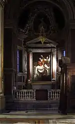 One painting that did not stay in its intended chapel is worth recording; Caravaggio's altarpiece of the Entombment of Christ was commissioned by Alessandro Vittrice, nephew of one of Saint Philip's friends, and depicted the entombment in a radically naturalistic format, foreign to the grand manner found in the remaining altarpieces. The original is in the Vatican Pinacoteca.[8] A copy by a Flemish painter now takes its place.
