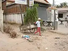 Child labour refers to the full-time employment of children under a minimum legal age.[1] In 2003, an International Labour Organization (ILO) survey reported that one in every ten children in the capital above the age of seven was engaged in child domestic labour.[1] Children who are too young to work in the fields work as scavengers.[2] They spend their days rummaging in dumps looking for items that can be sold for money.[2] Children also often work in the garment and textile industry, in prostitution, and in the military.[3][4][5]
