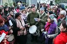 These masses are highly attended, because besides the religious side, they have a profane, playful and recreational side. In them, the choir and the faithful sing the songs of the occasion. At the end of the liturgical act, the people gather in the churchyard together, share food and drink - hot drinks (hot cocoa, coffee), liquors, poncha, traditional Christmas sweets, sandwiches made with carne de vinha d'alhos - all while singing groups are formed and regional musical instruments are played, such as rajão, castanets, braguinha or machete, pandeiro, pife, bombo and the bagpipe or harmonica. Although it is less frequent nowadays, fireworks are also launched.[1][6][5]