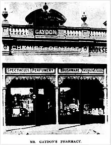In 1911, an upper floor was added.[4] This addition included the adjoining shop, so that a new and larger decorative pediment was created. A photograph dating from around 1913 shows that other tenants, including a bootmaker and the New Zealand Insurance Company, also used Gaydon's building. The upper floor was lit by a lantern and a pair of large compound windows and so had excellent light for its use a dental surgery by Thomas Gaydon, who in addition to his work as a pharmacist, also practised as a dentist, photographer and anaesthetist to the local hospital. He was a public-spirited man and also served as president of the Chamber of Commerce, School of Arts, hospital and School committees at various times. He was the second chairman of the Isis Shire Council in 1919 and served in this role again between 1924 and 1930.[1]